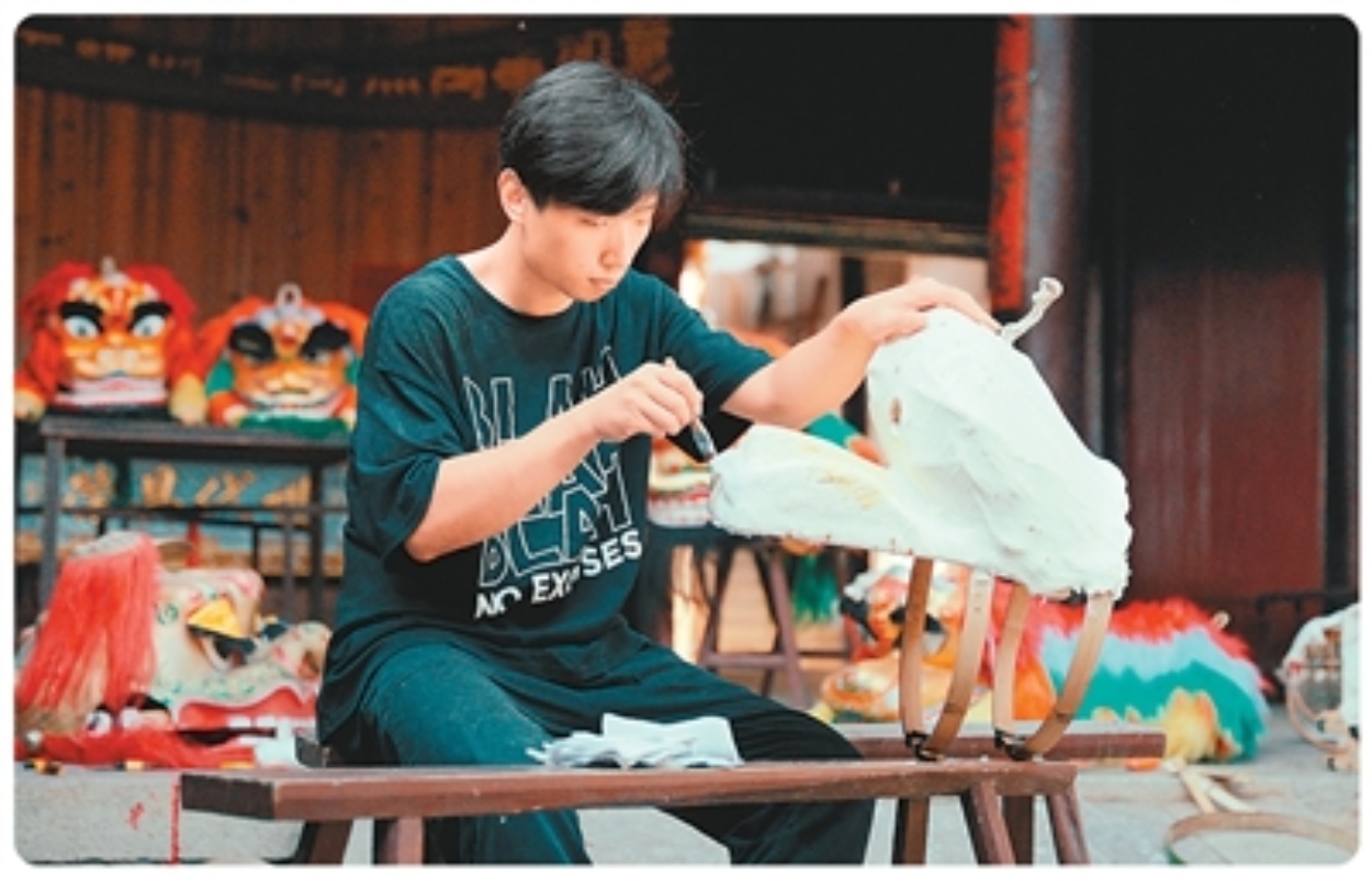 图为福建省宁德市蕉城区霍童镇“兴贤少年线狮队”领队陈吉宏正在制作线狮。